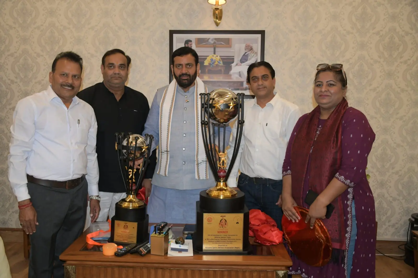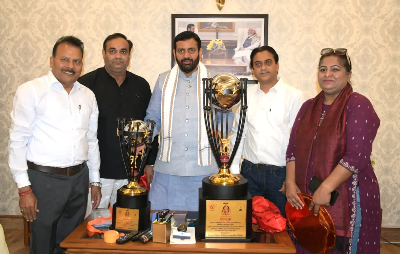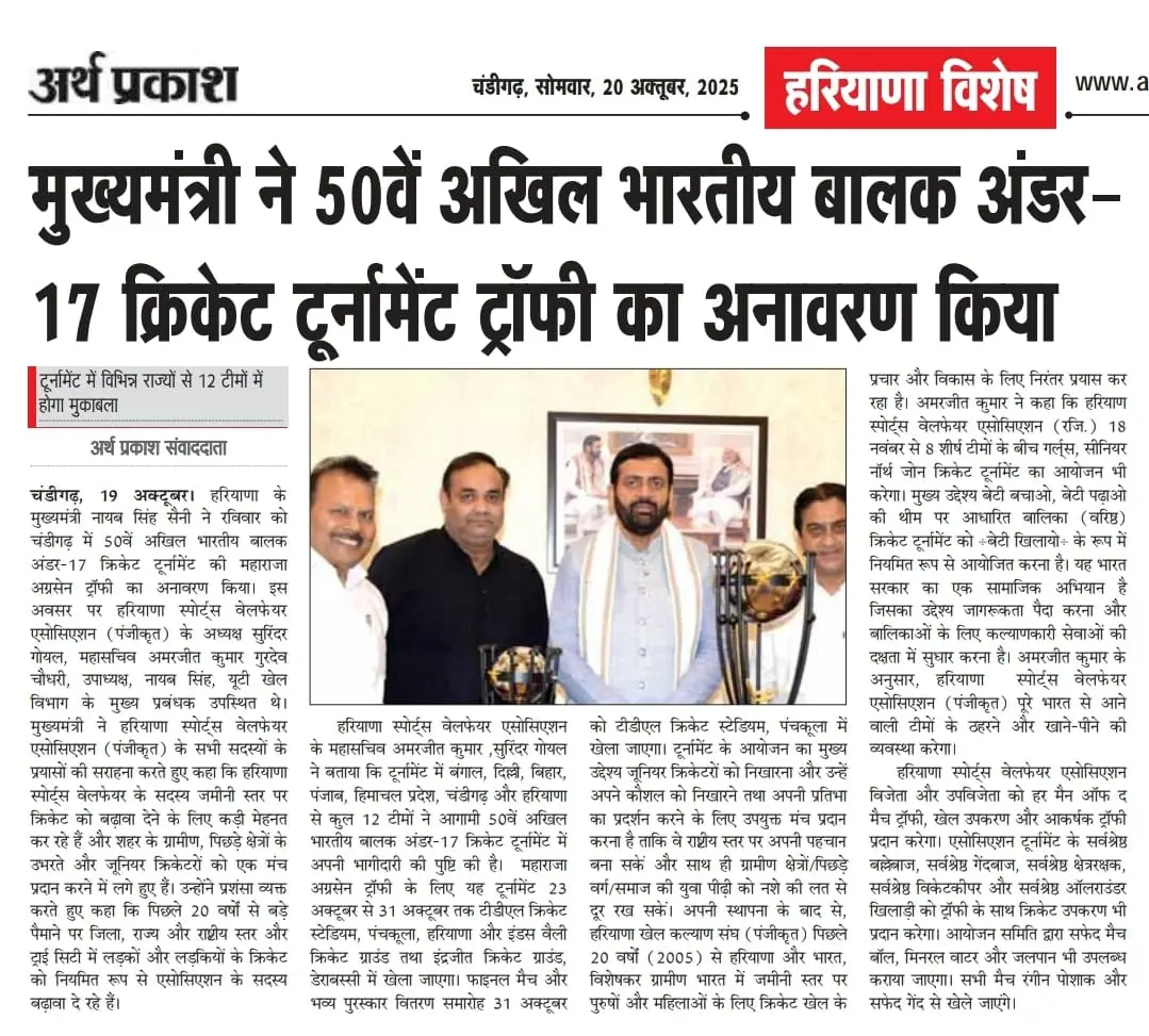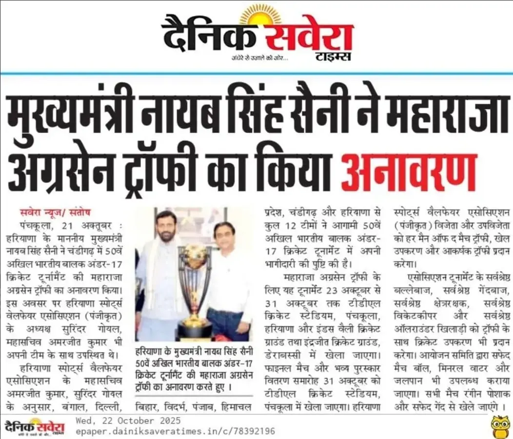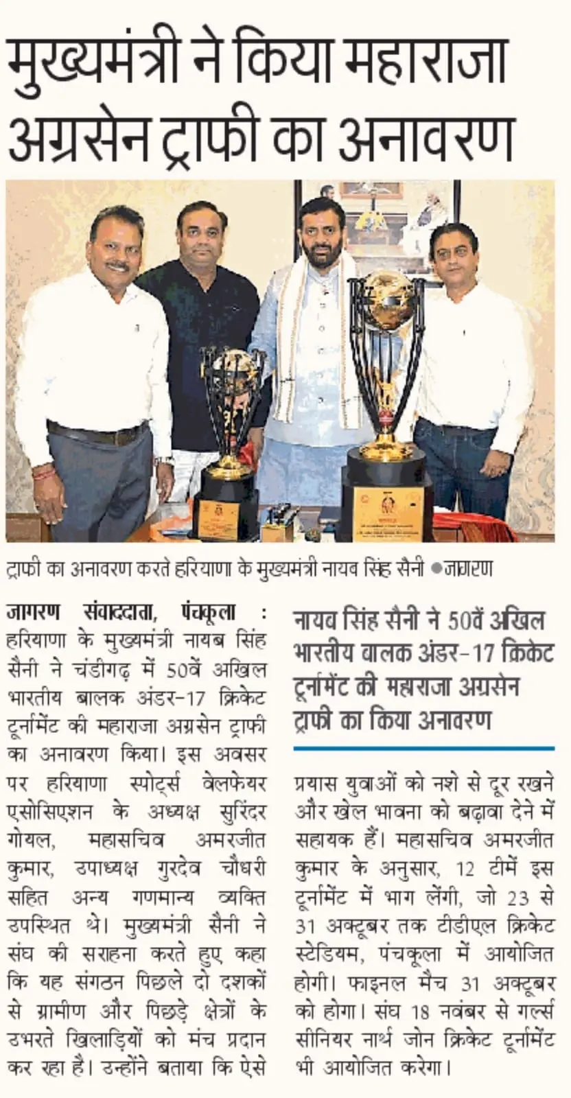हरियाणा के माननीय मुख्यमंत्री श्री नायब सिंह सैनी ने 50वें अखिल भारतीय बालक अंडर-17 क्रिकेट टूर्नामेंट की महाराजा अग्रसेन ट्रॉफी का अनावरण किया
