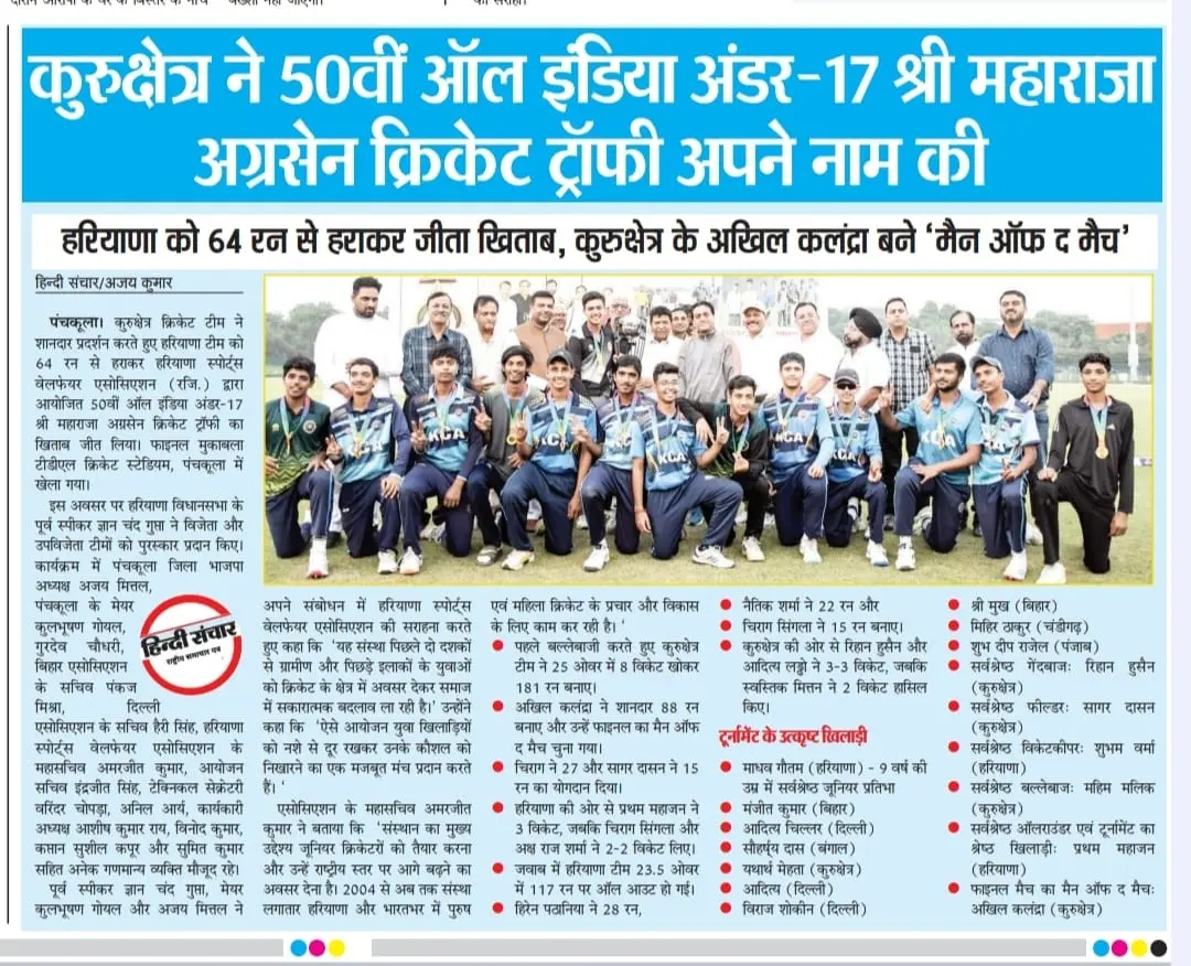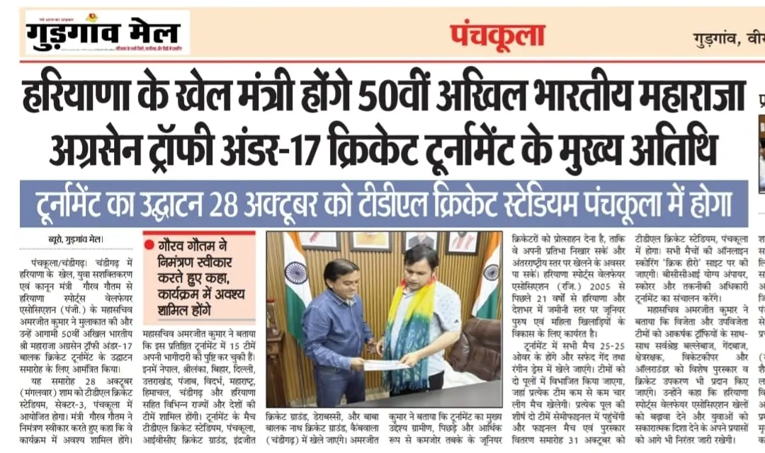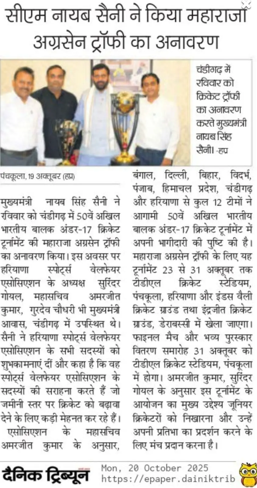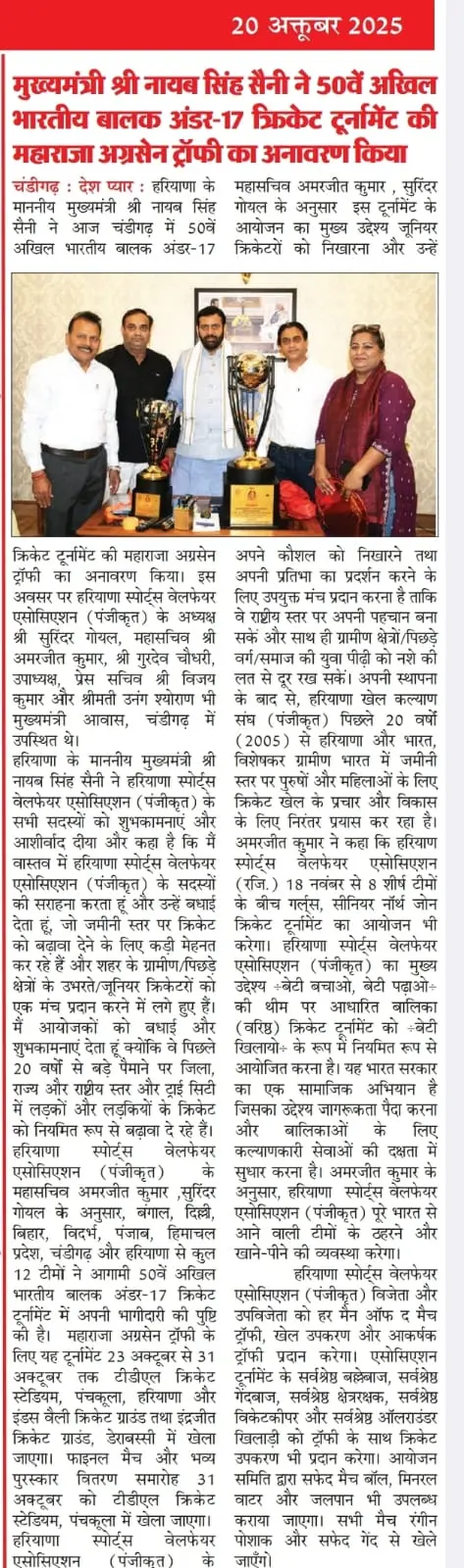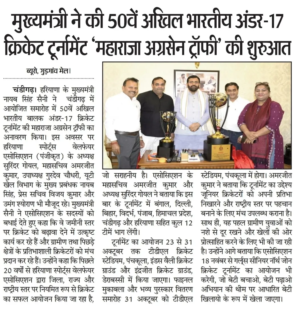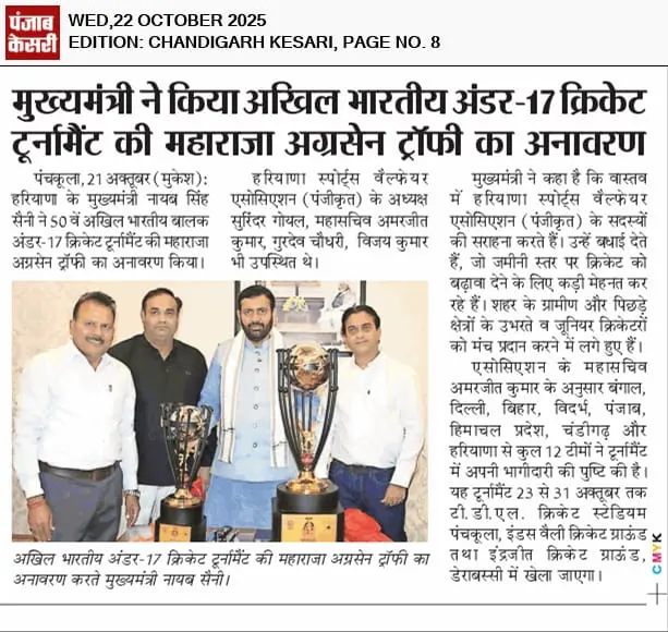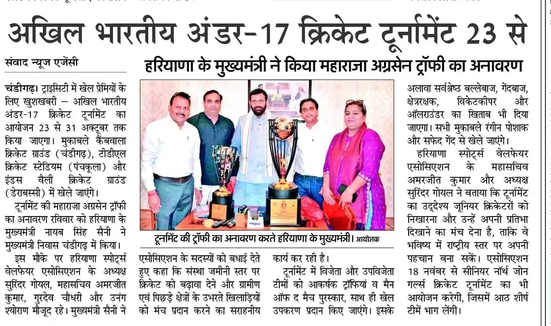 हरियाणा स्पोर्ट्स वेलफेयर एसोसिएशन (पंजीकृत) के महासचिव अमरजीत कुमार ,सुरिंदर गोयल के अनुसार, बंगाल, दिल्ली, बिहार, विदर्भ, पंजाब, हिमाचल प्रदेश, चंडीगढ़ और हरियाणा से कुल 12 टीमों ने आगामी 50वें अखिल भारतीय बालक अंडर-17 क्रिकेट टूर्नामेंट में अपनी भागीदारी की पुष्टि की है। महाराजा अग्रसेन ट्रॉफी के लिए यह टूर्नामेंट 23 अक्टूबर से 31 अक्टूबर तक टीडीएल क्रिकेट स्टेडियम, पंचकूला, हरियाणा और इंडस वैली क्रिकेट ग्राउंड तथा इंद्रजीत क्रिकेट ग्राउंड, डेराबस्सी में खेला जाएगा। फाइनल मैच और भव्य पुरस्कार वितरण समारोह 31 अक्टूबर को टीडीएल क्रिकेट स्टेडियम, पंचकूला में खेला जाएगा।