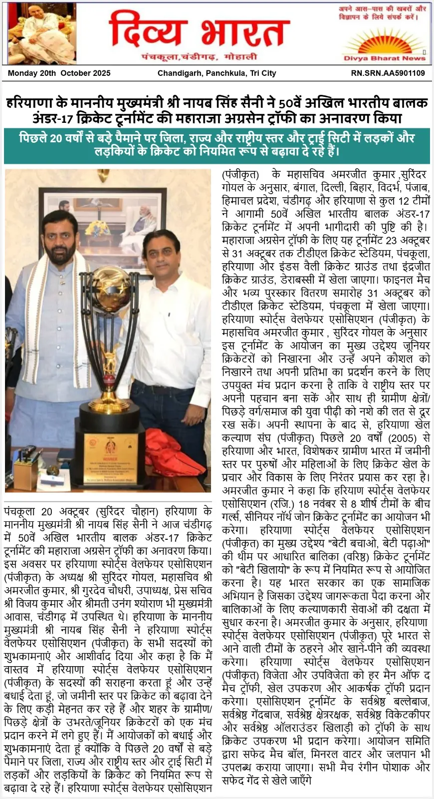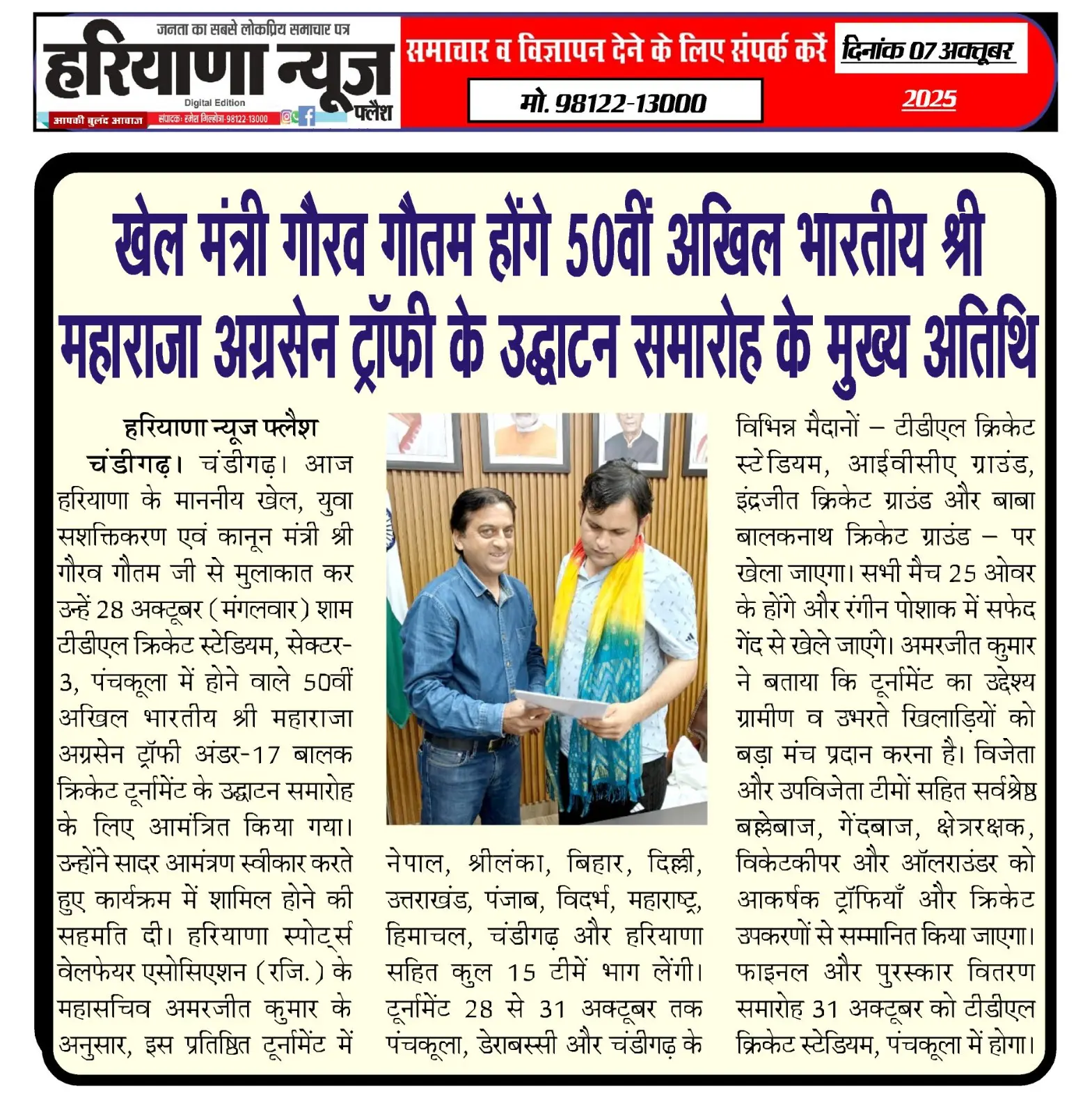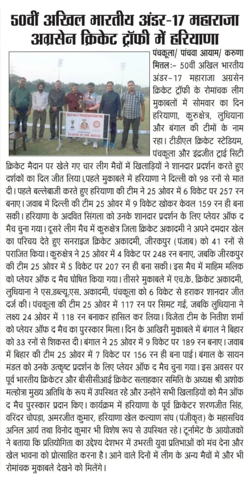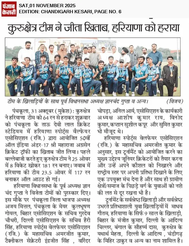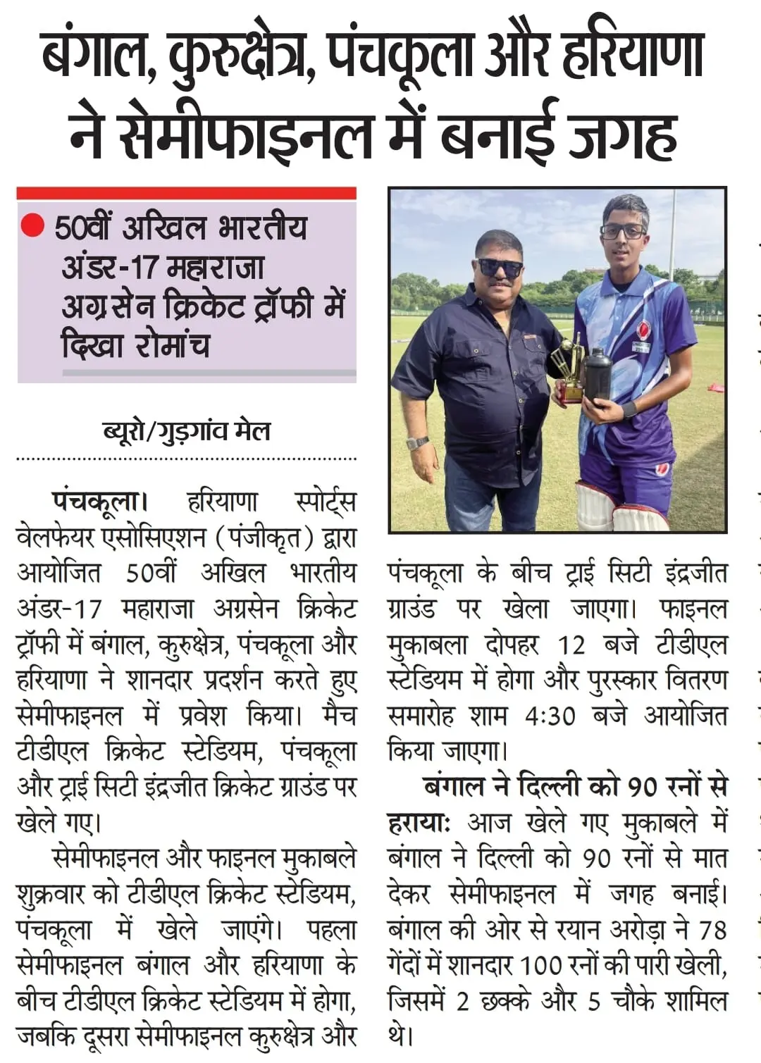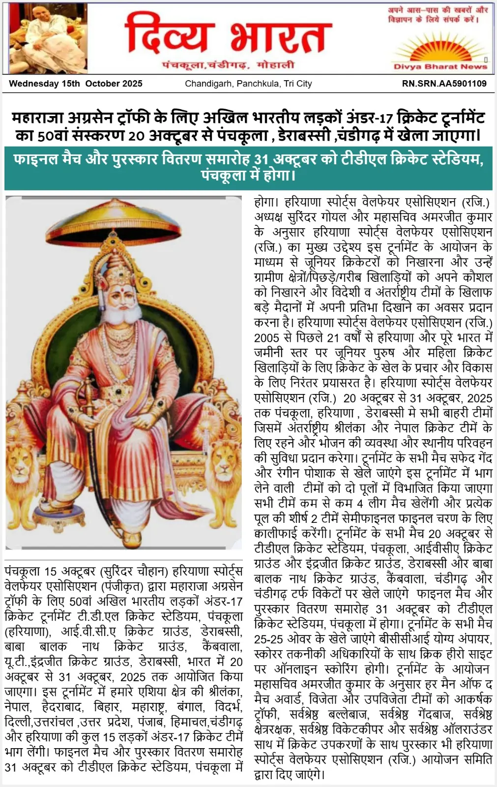 हरियाणा स्पोर्ट्स वेलफेयर एसोसिएशन (पंजीकृत) के महासचिव अमरजीत कुमार ,सुरिंदर गोयल के अनुसार, बंगाल, दिल्ली, बिहार, विदर्भ, पंजाब, हिमाचल प्रदेश, चंडीगढ़ और हरियाणा से कुल 12 टीमों ने आगामी 50वें अखिल भारतीय बालक अंडर-17 क्रिकेट टूर्नामेंट में अपनी भागीदारी की पुष्टि की है। महाराजा अग्रसेन ट्रॉफी के लिए यह टूर्नामेंट 23 अक्टूबर से 31 अक्टूबर तक टीडीएल क्रिकेट स्टेडियम, पंचकूला, हरियाणा और इंडस वैली क्रिकेट ग्राउंड तथा इंद्रजीत क्रिकेट ग्राउंड, डेराबस्सी में खेला जाएगा। फाइनल मैच और भव्य पुरस्कार वितरण समारोह 31 अक्टूबर को टीडीएल क्रिकेट स्टेडियम, पंचकूला में खेला जाएगा।