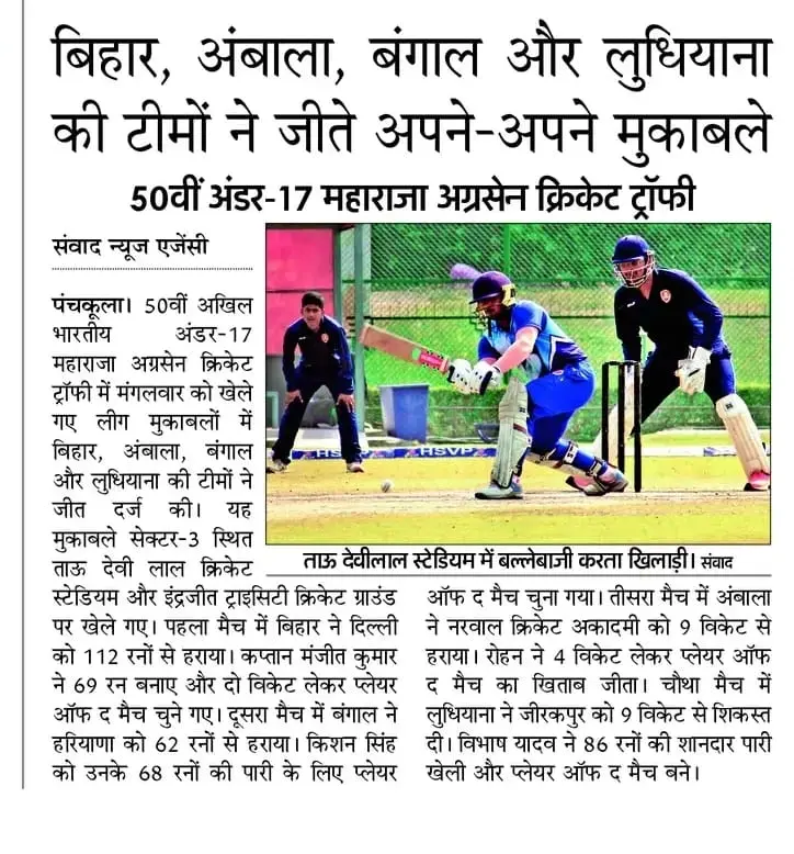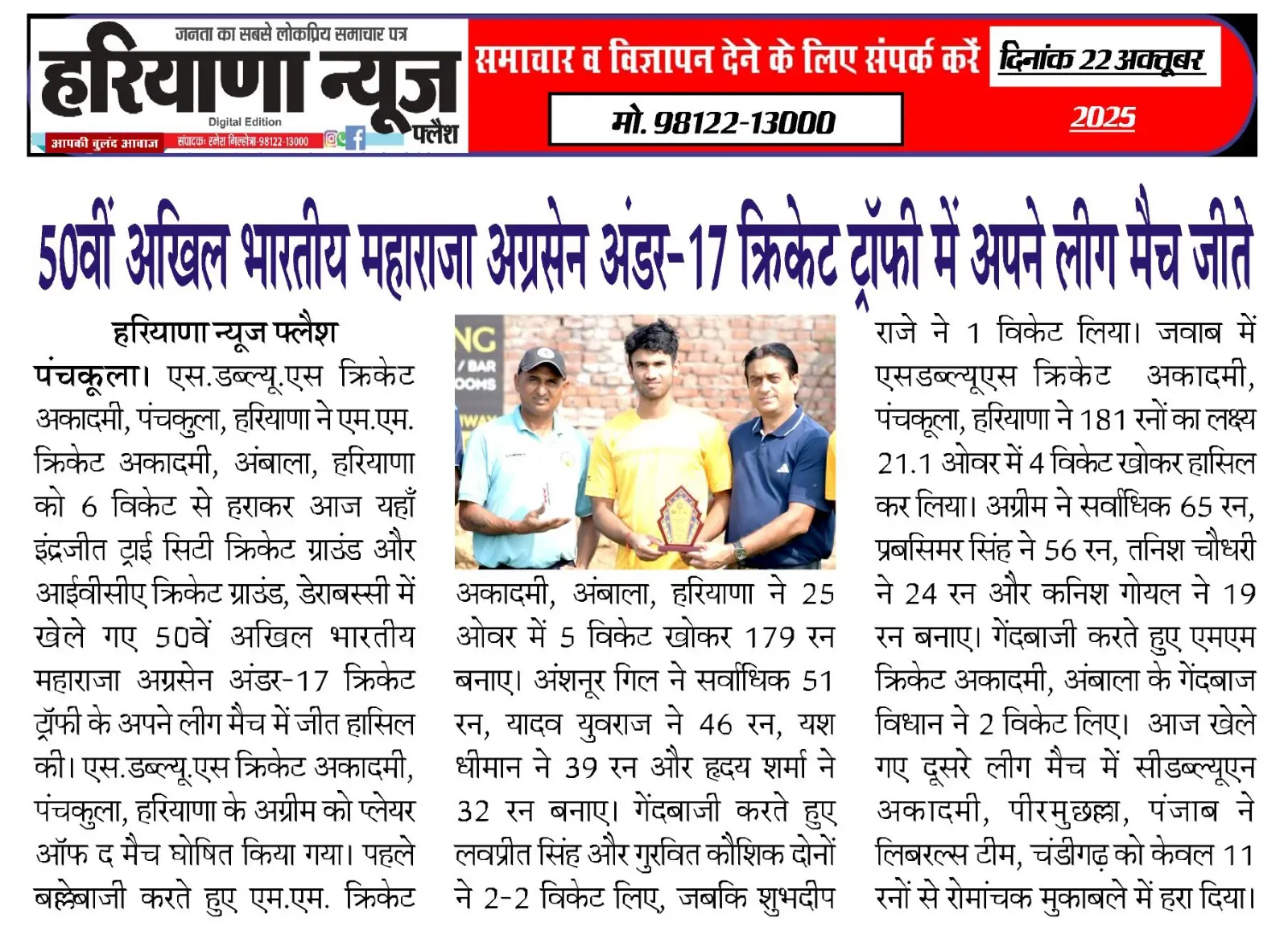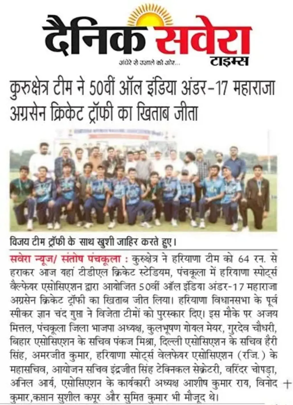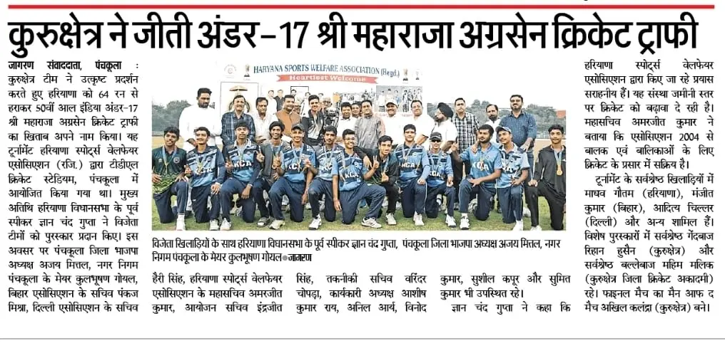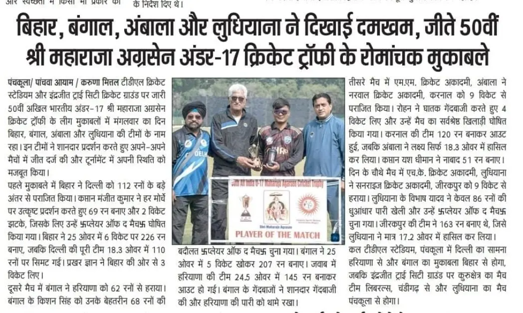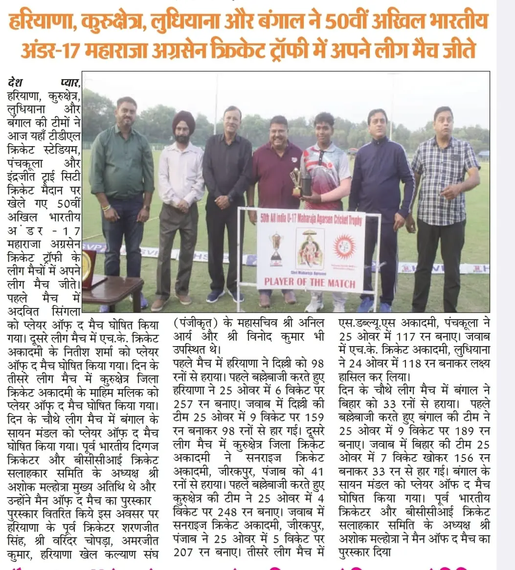 हरियाणा स्पोर्ट्स वेलफेयर एसोसिएशन (पंजीकृत) के महासचिव अमरजीत कुमार ,सुरिंदर गोयल के अनुसार, बंगाल, दिल्ली, बिहार, विदर्भ, पंजाब, हिमाचल प्रदेश, चंडीगढ़ और हरियाणा से कुल 12 टीमों ने आगामी 50वें अखिल भारतीय बालक अंडर-17 क्रिकेट टूर्नामेंट में अपनी भागीदारी की पुष्टि की है। महाराजा अग्रसेन ट्रॉफी के लिए यह टूर्नामेंट 23 अक्टूबर से 31 अक्टूबर तक टीडीएल क्रिकेट स्टेडियम, पंचकूला, हरियाणा और इंडस वैली क्रिकेट ग्राउंड तथा इंद्रजीत क्रिकेट ग्राउंड, डेराबस्सी में खेला जाएगा। फाइनल मैच और भव्य पुरस्कार वितरण समारोह 31 अक्टूबर को टीडीएल क्रिकेट स्टेडियम, पंचकूला में खेला जाएगा।