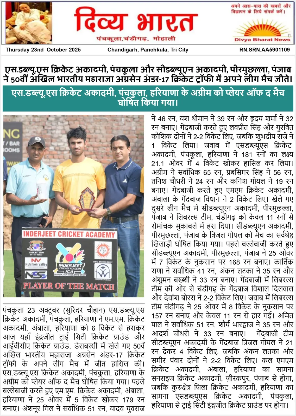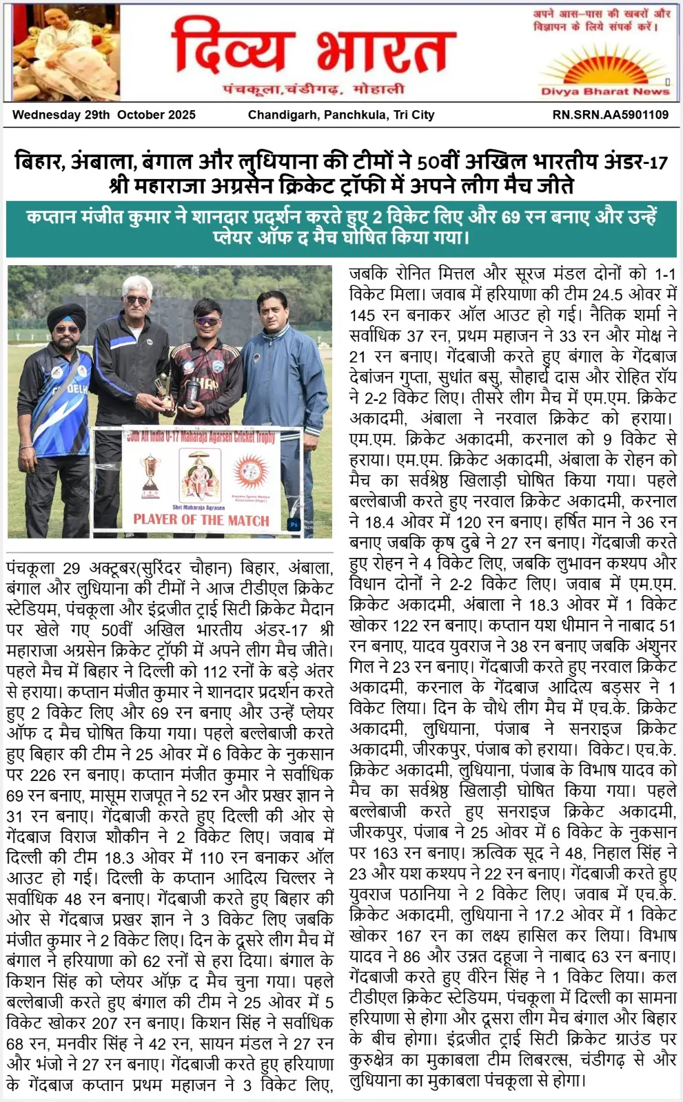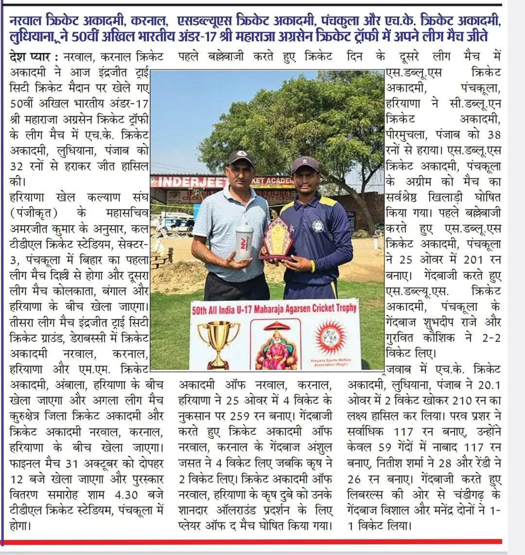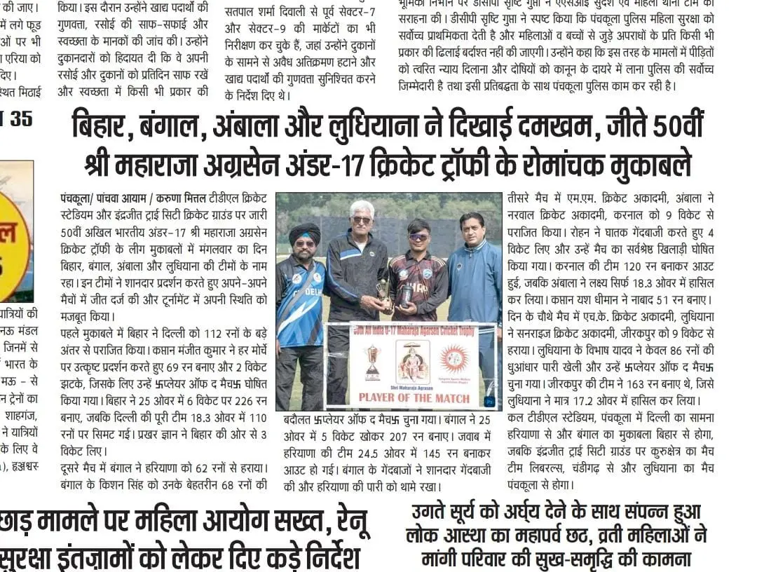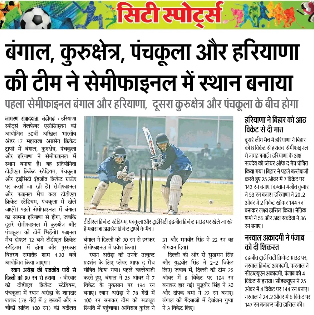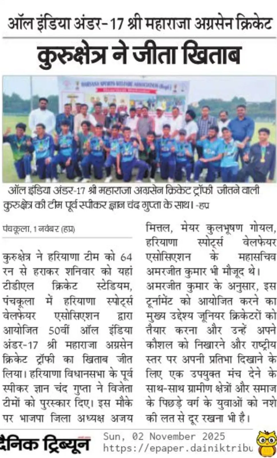 हरियाणा स्पोर्ट्स वेलफेयर एसोसिएशन (पंजीकृत) के महासचिव अमरजीत कुमार ,सुरिंदर गोयल के अनुसार, बंगाल, दिल्ली, बिहार, विदर्भ, पंजाब, हिमाचल प्रदेश, चंडीगढ़ और हरियाणा से कुल 12 टीमों ने आगामी 50वें अखिल भारतीय बालक अंडर-17 क्रिकेट टूर्नामेंट में अपनी भागीदारी की पुष्टि की है। महाराजा अग्रसेन ट्रॉफी के लिए यह टूर्नामेंट 23 अक्टूबर से 31 अक्टूबर तक टीडीएल क्रिकेट स्टेडियम, पंचकूला, हरियाणा और इंडस वैली क्रिकेट ग्राउंड तथा इंद्रजीत क्रिकेट ग्राउंड, डेराबस्सी में खेला जाएगा। फाइनल मैच और भव्य पुरस्कार वितरण समारोह 31 अक्टूबर को टीडीएल क्रिकेट स्टेडियम, पंचकूला में खेला जाएगा।