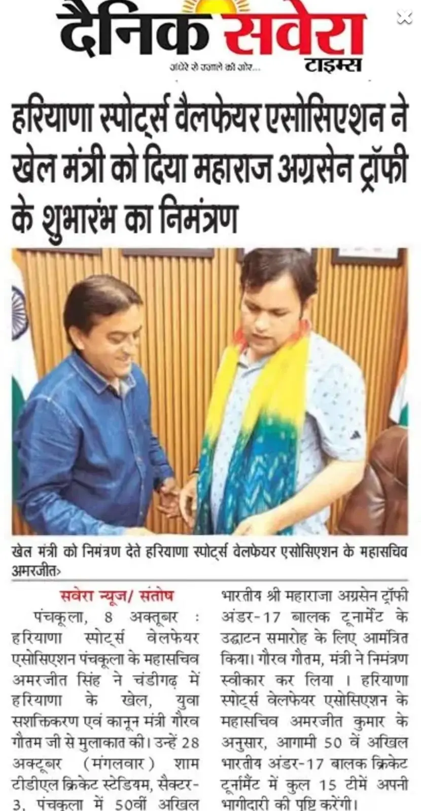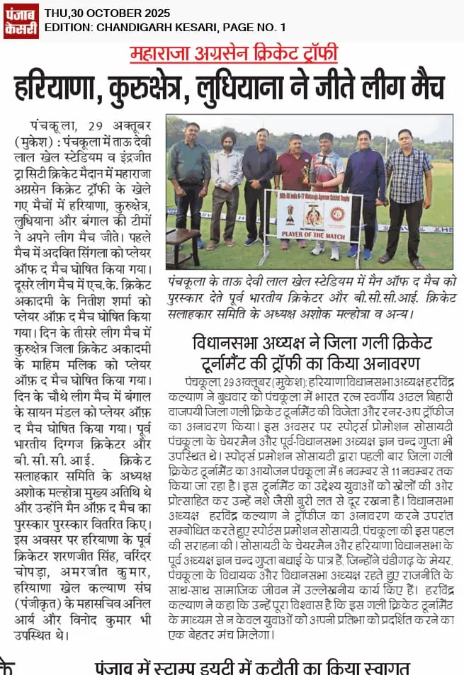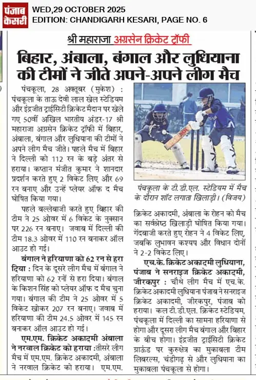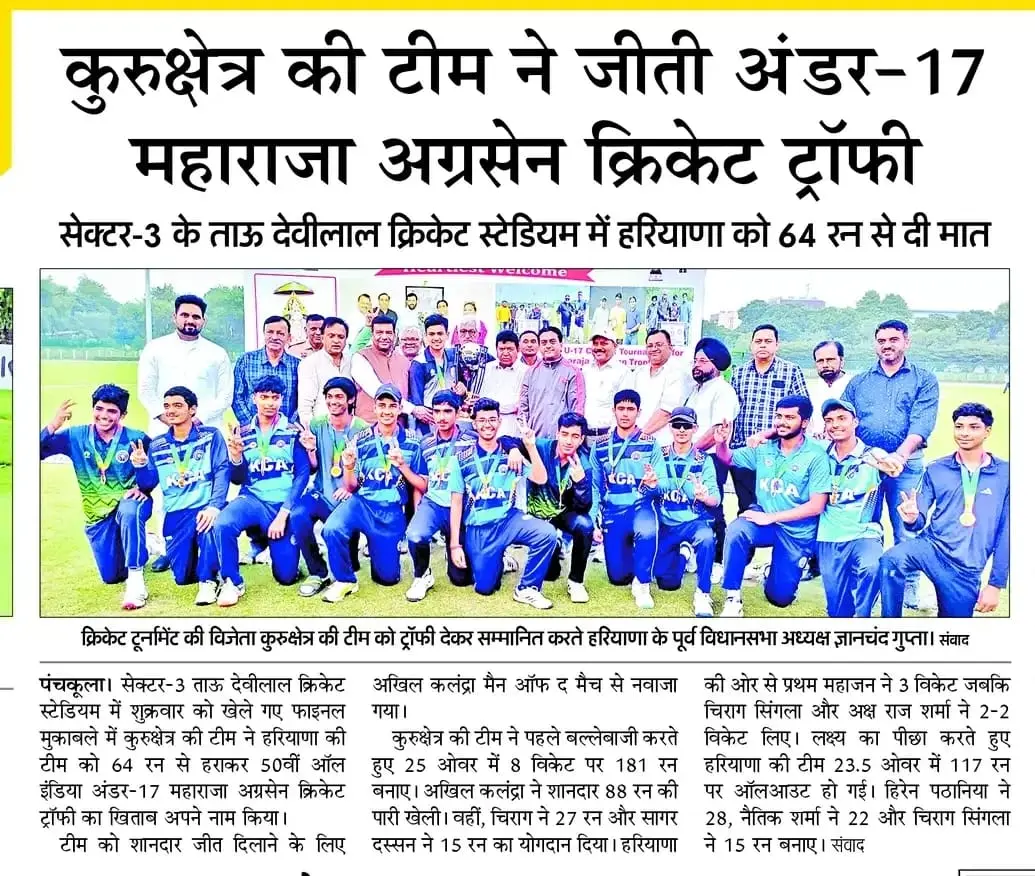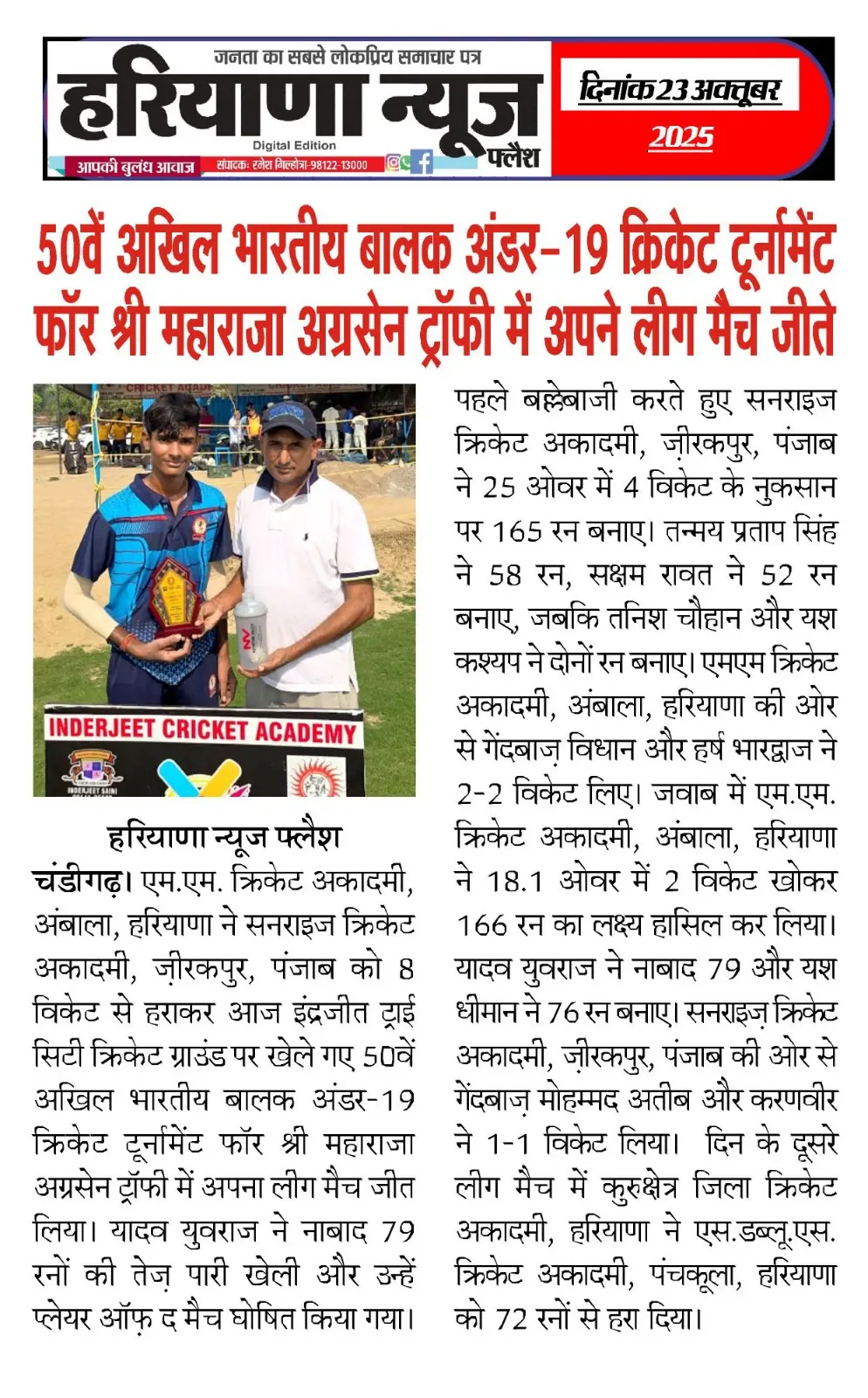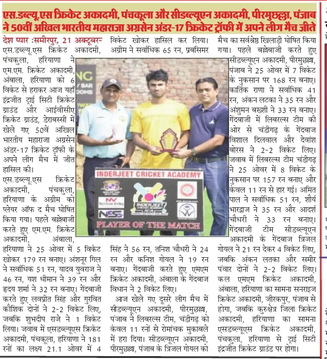 हरियाणा स्पोर्ट्स वेलफेयर एसोसिएशन (पंजीकृत) के महासचिव अमरजीत कुमार ,सुरिंदर गोयल के अनुसार, बंगाल, दिल्ली, बिहार, विदर्भ, पंजाब, हिमाचल प्रदेश, चंडीगढ़ और हरियाणा से कुल 12 टीमों ने आगामी 50वें अखिल भारतीय बालक अंडर-17 क्रिकेट टूर्नामेंट में अपनी भागीदारी की पुष्टि की है। महाराजा अग्रसेन ट्रॉफी के लिए यह टूर्नामेंट 23 अक्टूबर से 31 अक्टूबर तक टीडीएल क्रिकेट स्टेडियम, पंचकूला, हरियाणा और इंडस वैली क्रिकेट ग्राउंड तथा इंद्रजीत क्रिकेट ग्राउंड, डेराबस्सी में खेला जाएगा। फाइनल मैच और भव्य पुरस्कार वितरण समारोह 31 अक्टूबर को टीडीएल क्रिकेट स्टेडियम, पंचकूला में खेला जाएगा।