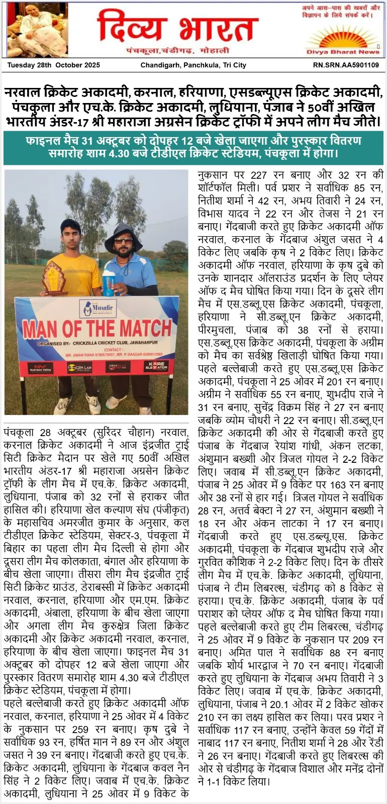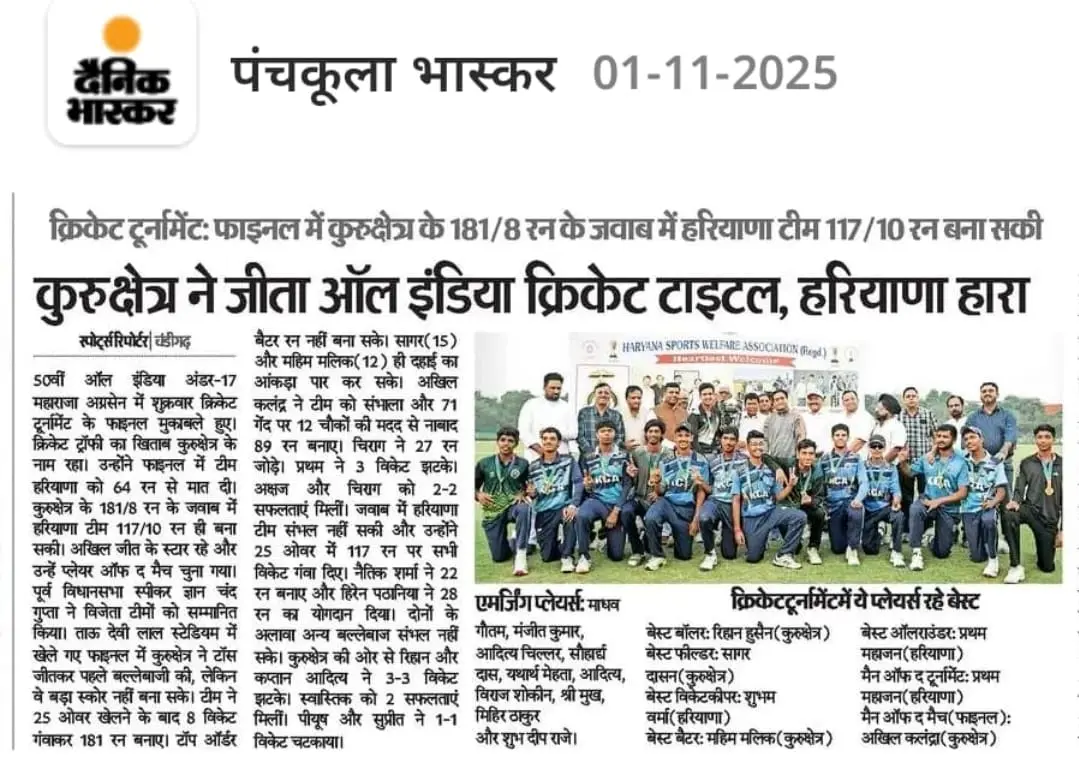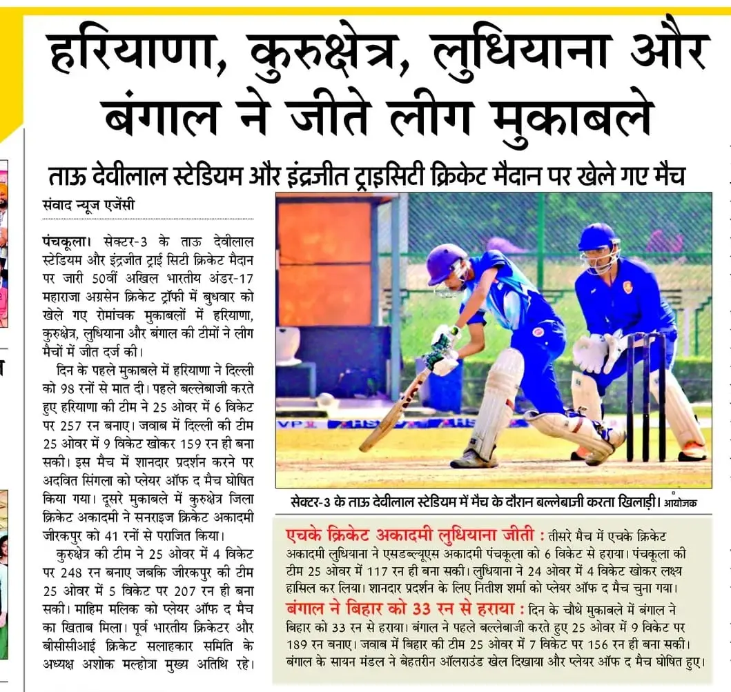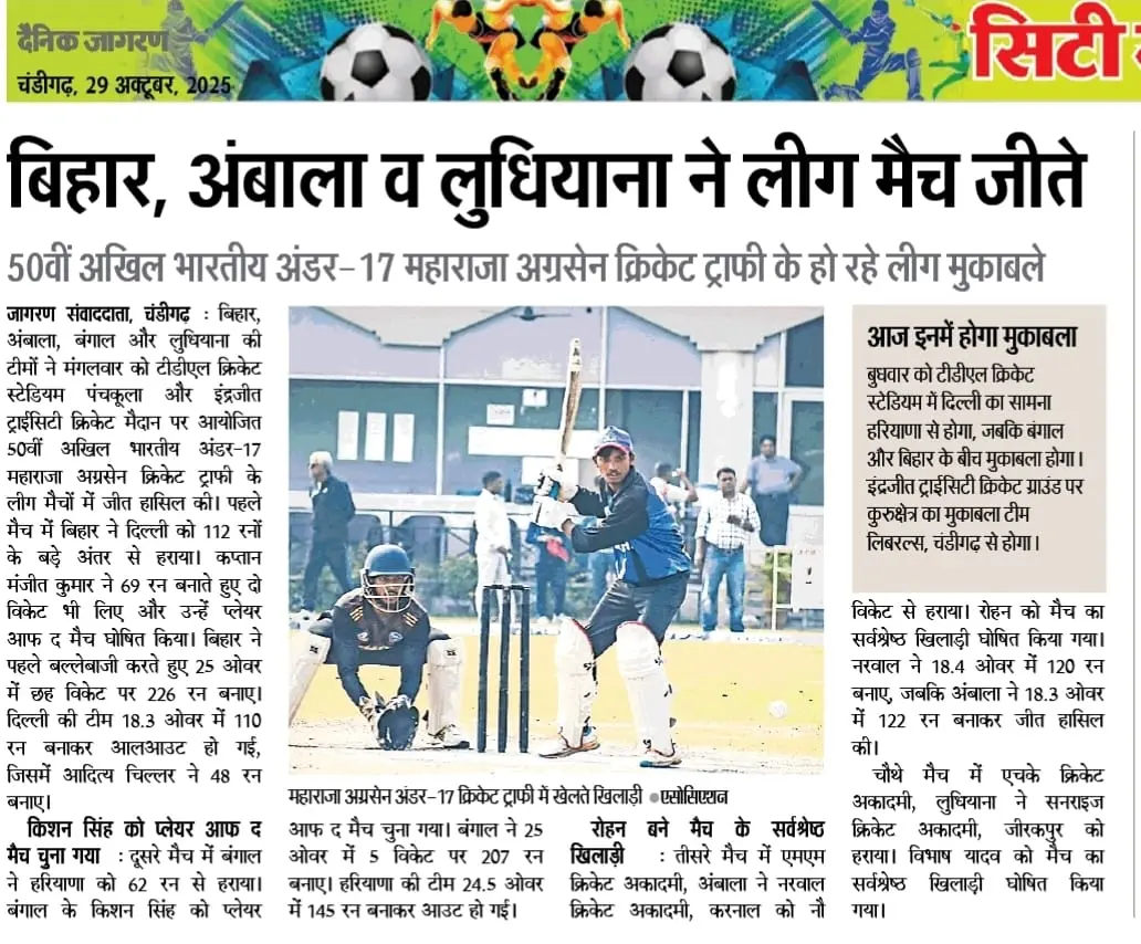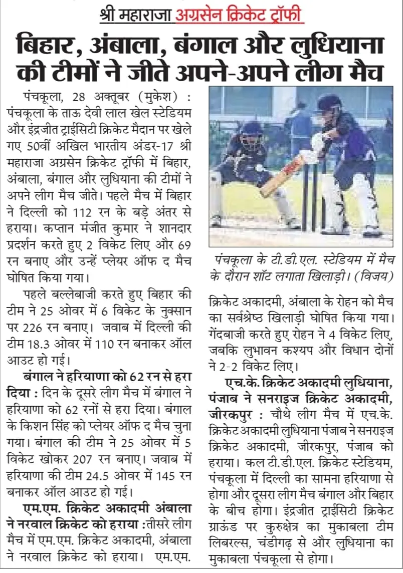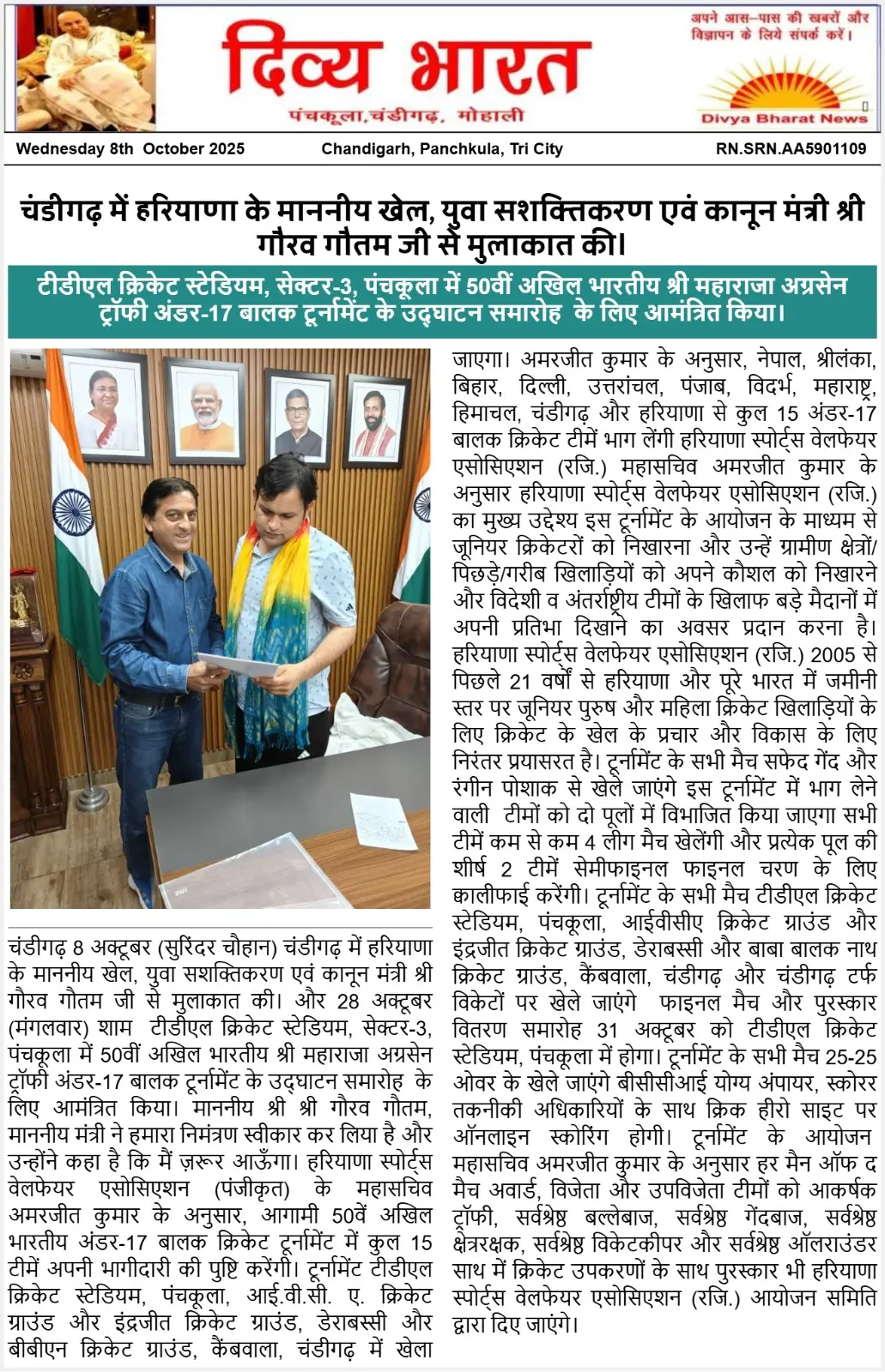 हरियाणा स्पोर्ट्स वेलफेयर एसोसिएशन (पंजीकृत) के महासचिव अमरजीत कुमार ,सुरिंदर गोयल के अनुसार, बंगाल, दिल्ली, बिहार, विदर्भ, पंजाब, हिमाचल प्रदेश, चंडीगढ़ और हरियाणा से कुल 12 टीमों ने आगामी 50वें अखिल भारतीय बालक अंडर-17 क्रिकेट टूर्नामेंट में अपनी भागीदारी की पुष्टि की है। महाराजा अग्रसेन ट्रॉफी के लिए यह टूर्नामेंट 23 अक्टूबर से 31 अक्टूबर तक टीडीएल क्रिकेट स्टेडियम, पंचकूला, हरियाणा और इंडस वैली क्रिकेट ग्राउंड तथा इंद्रजीत क्रिकेट ग्राउंड, डेराबस्सी में खेला जाएगा। फाइनल मैच और भव्य पुरस्कार वितरण समारोह 31 अक्टूबर को टीडीएल क्रिकेट स्टेडियम, पंचकूला में खेला जाएगा।