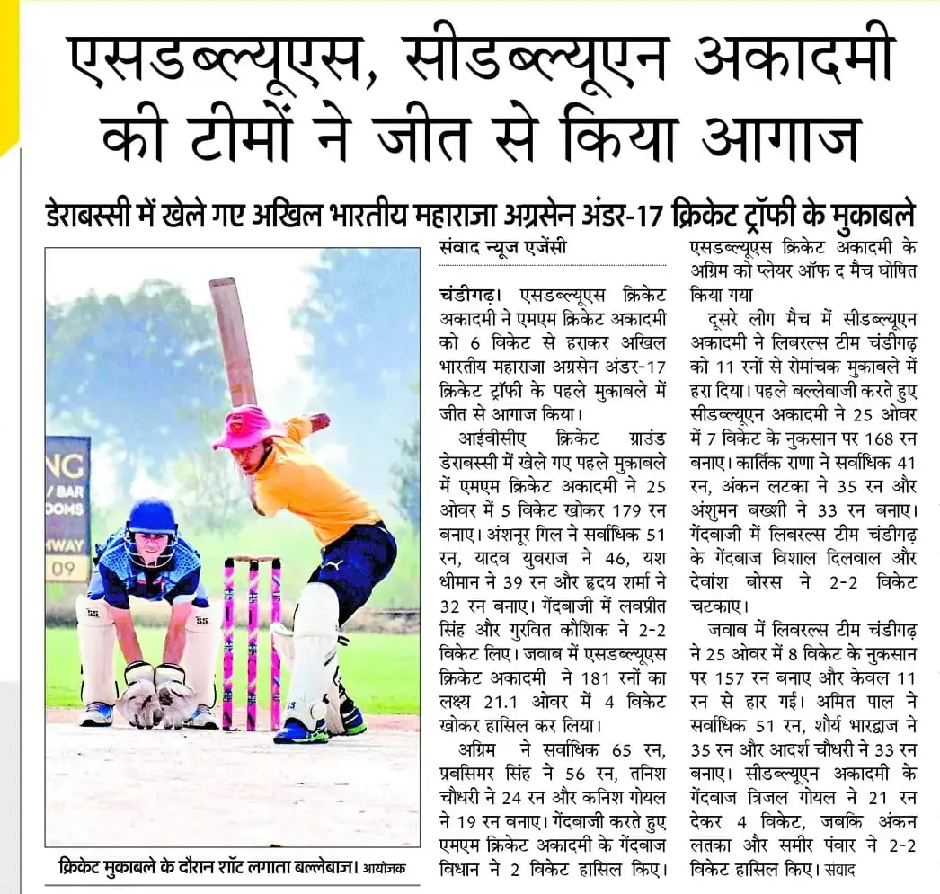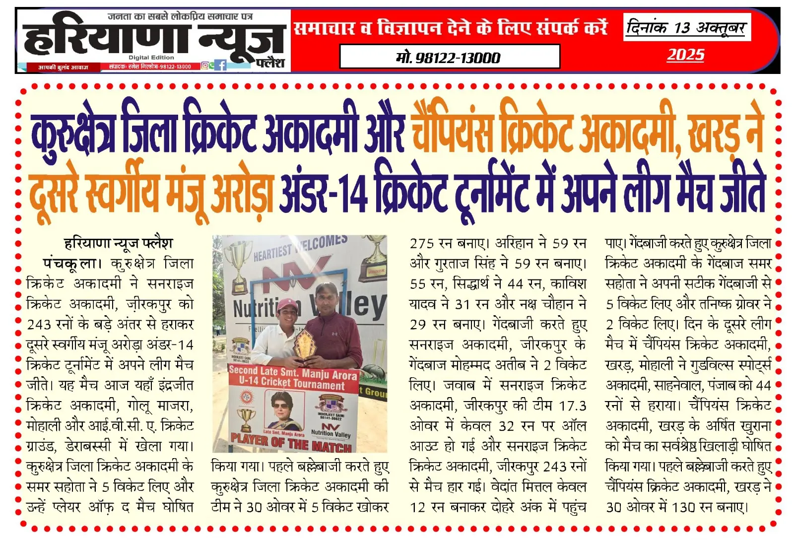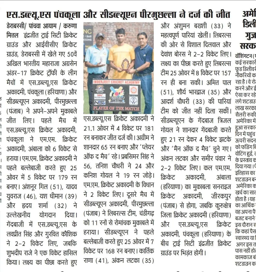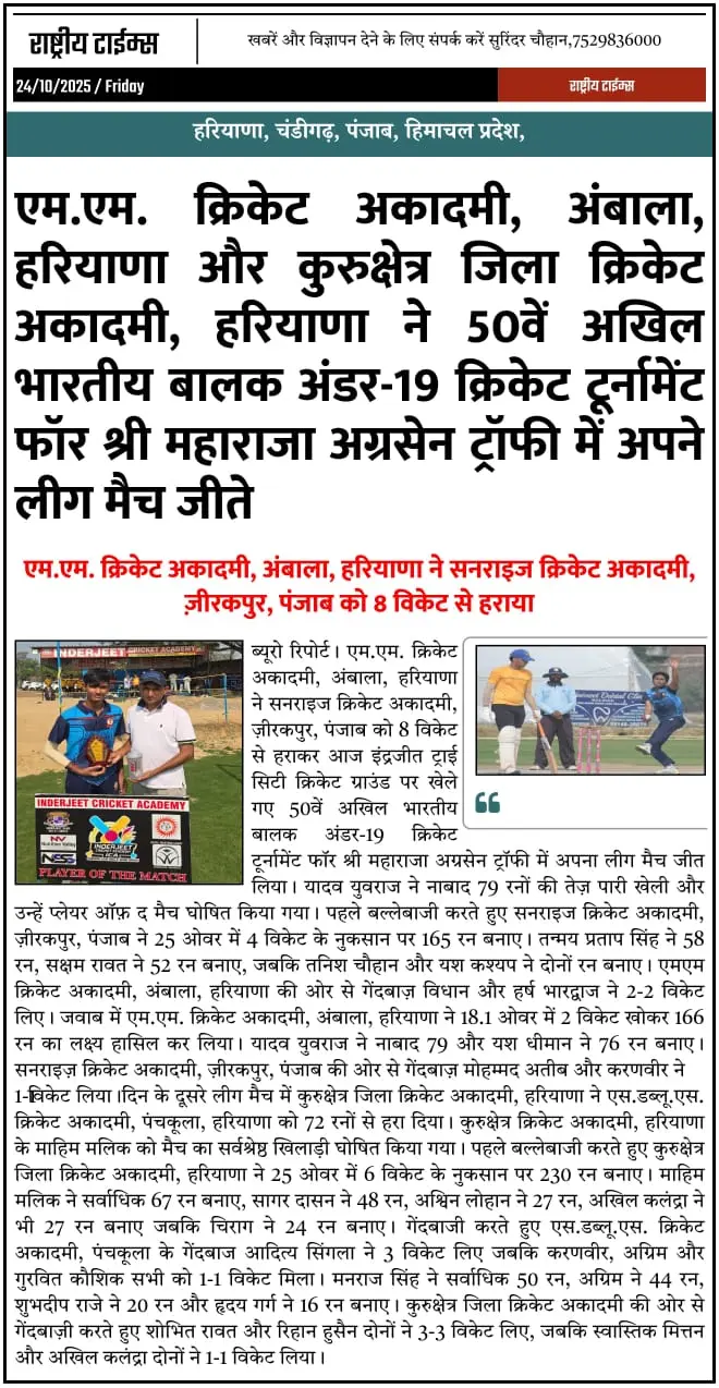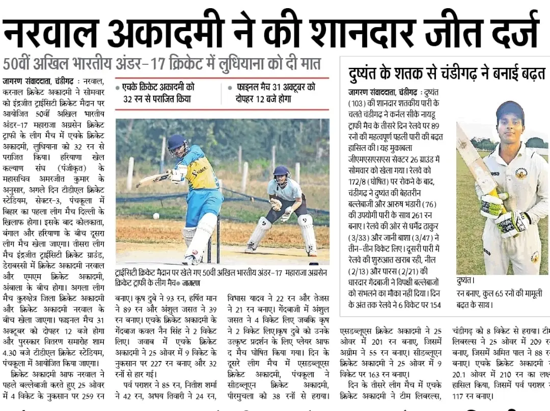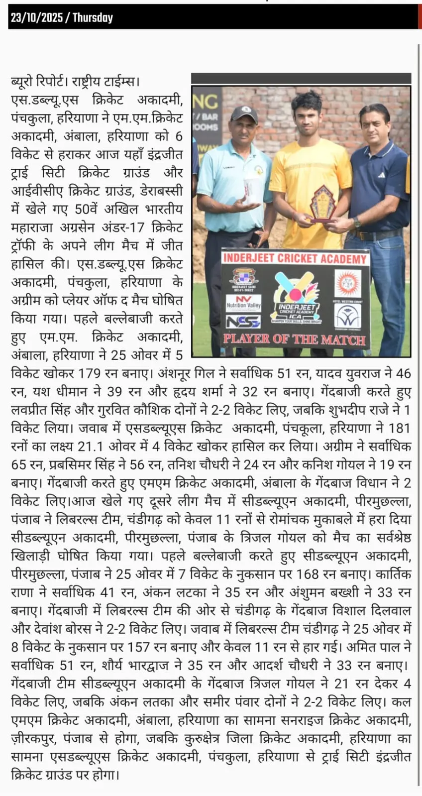 हरियाणा स्पोर्ट्स वेलफेयर एसोसिएशन (पंजीकृत) के महासचिव अमरजीत कुमार ,सुरिंदर गोयल के अनुसार, बंगाल, दिल्ली, बिहार, विदर्भ, पंजाब, हिमाचल प्रदेश, चंडीगढ़ और हरियाणा से कुल 12 टीमों ने आगामी 50वें अखिल भारतीय बालक अंडर-17 क्रिकेट टूर्नामेंट में अपनी भागीदारी की पुष्टि की है। महाराजा अग्रसेन ट्रॉफी के लिए यह टूर्नामेंट 23 अक्टूबर से 31 अक्टूबर तक टीडीएल क्रिकेट स्टेडियम, पंचकूला, हरियाणा और इंडस वैली क्रिकेट ग्राउंड तथा इंद्रजीत क्रिकेट ग्राउंड, डेराबस्सी में खेला जाएगा। फाइनल मैच और भव्य पुरस्कार वितरण समारोह 31 अक्टूबर को टीडीएल क्रिकेट स्टेडियम, पंचकूला में खेला जाएगा।
