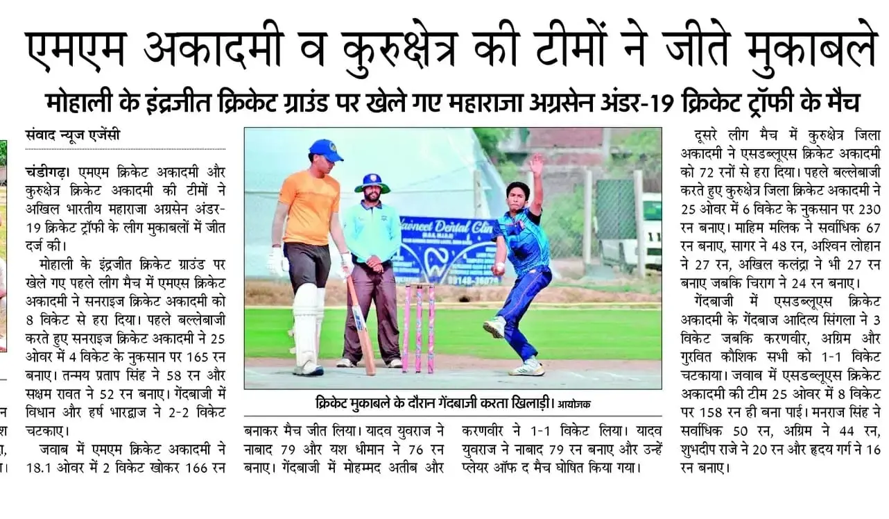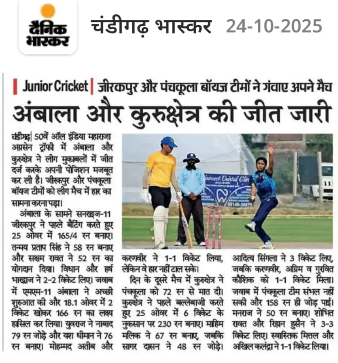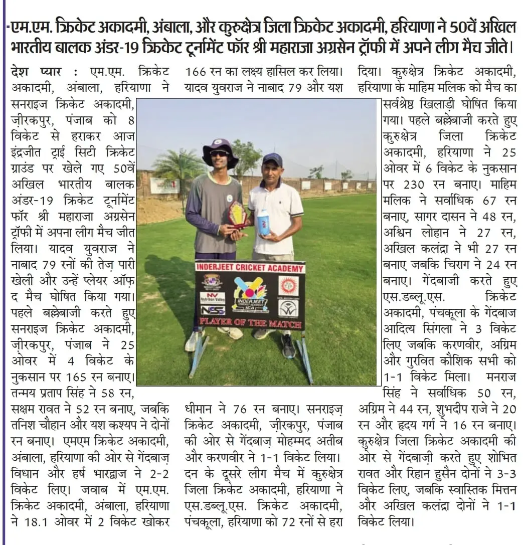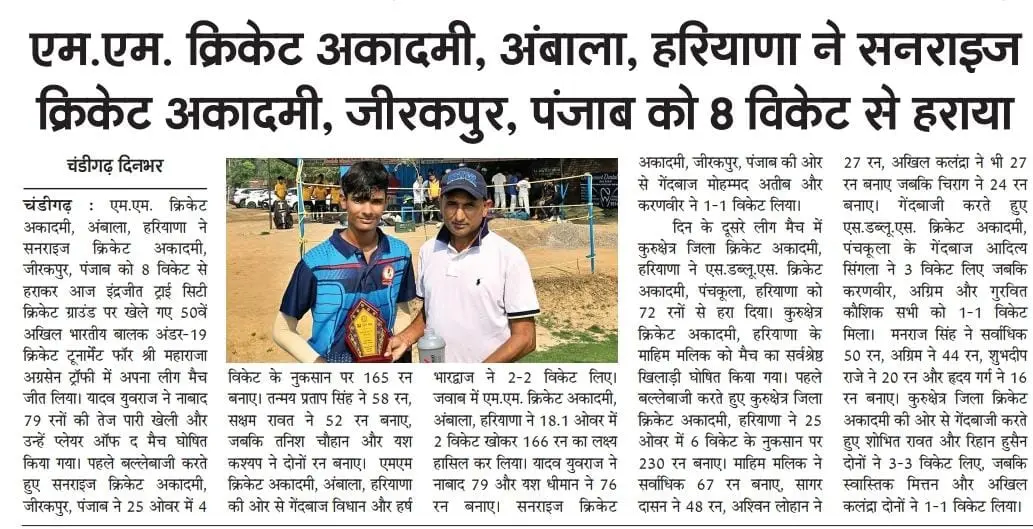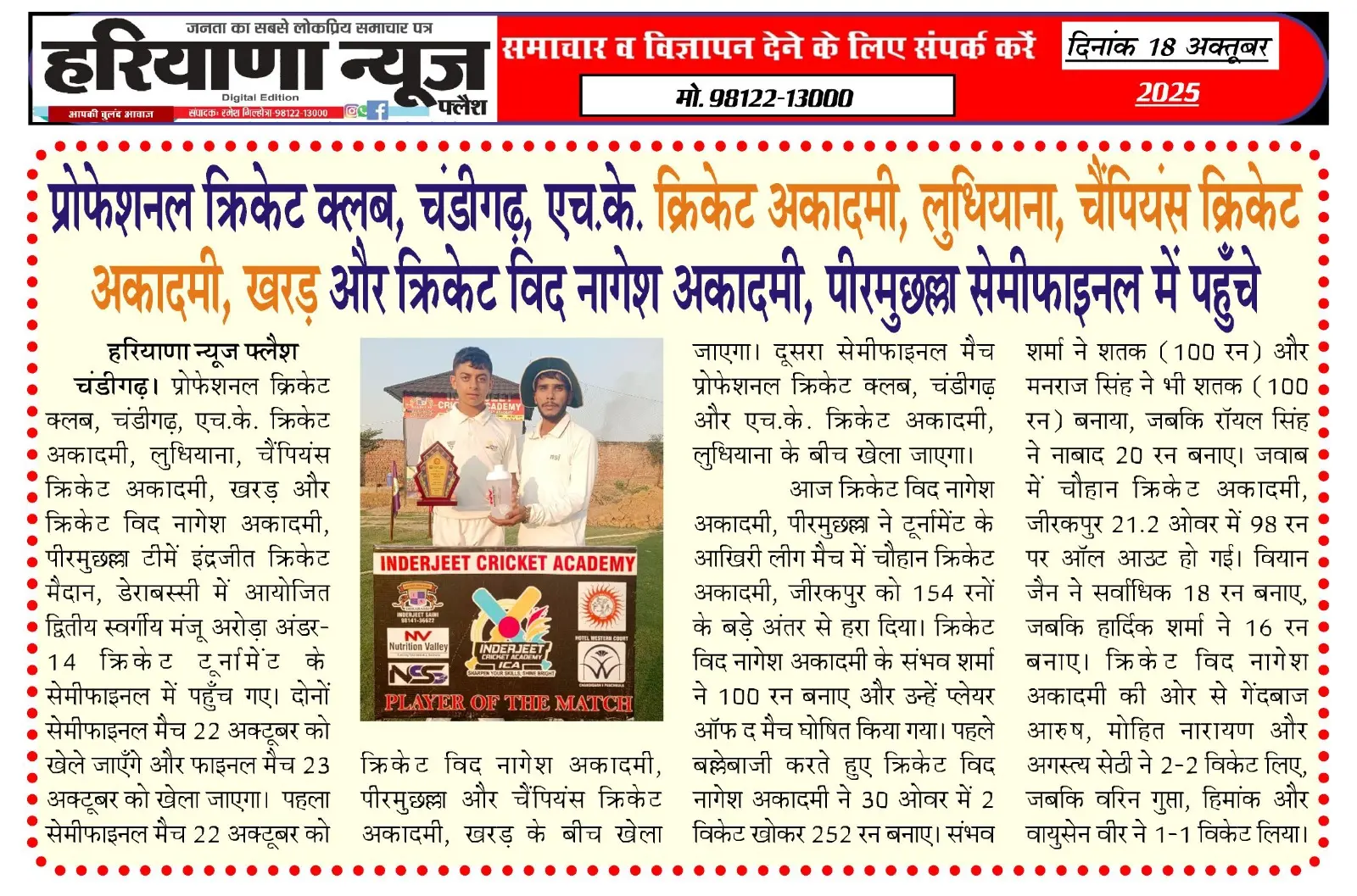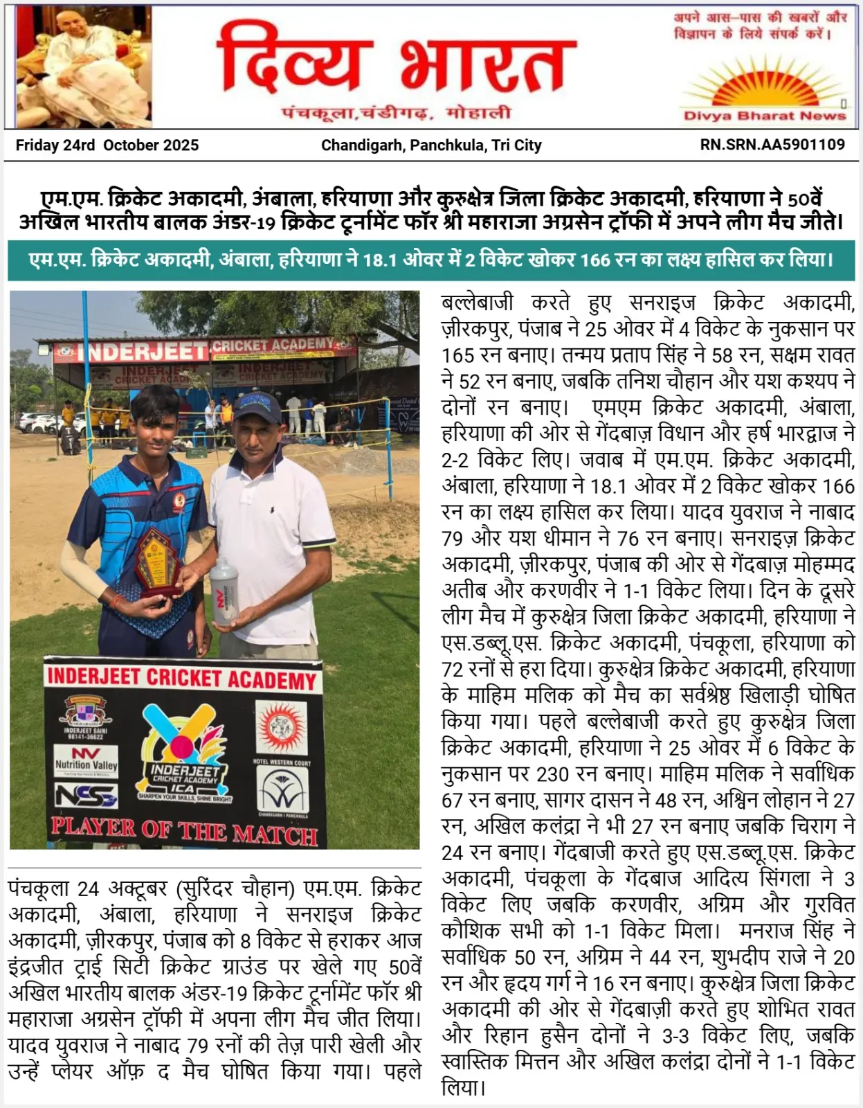 हरियाणा स्पोर्ट्स वेलफेयर एसोसिएशन (पंजीकृत) के महासचिव अमरजीत कुमार ,सुरिंदर गोयल के अनुसार, बंगाल, दिल्ली, बिहार, विदर्भ, पंजाब, हिमाचल प्रदेश, चंडीगढ़ और हरियाणा से कुल 12 टीमों ने आगामी 50वें अखिल भारतीय बालक अंडर-17 क्रिकेट टूर्नामेंट में अपनी भागीदारी की पुष्टि की है। महाराजा अग्रसेन ट्रॉफी के लिए यह टूर्नामेंट 23 अक्टूबर से 31 अक्टूबर तक टीडीएल क्रिकेट स्टेडियम, पंचकूला, हरियाणा और इंडस वैली क्रिकेट ग्राउंड तथा इंद्रजीत क्रिकेट ग्राउंड, डेराबस्सी में खेला जाएगा। फाइनल मैच और भव्य पुरस्कार वितरण समारोह 31 अक्टूबर को टीडीएल क्रिकेट स्टेडियम, पंचकूला में खेला जाएगा।